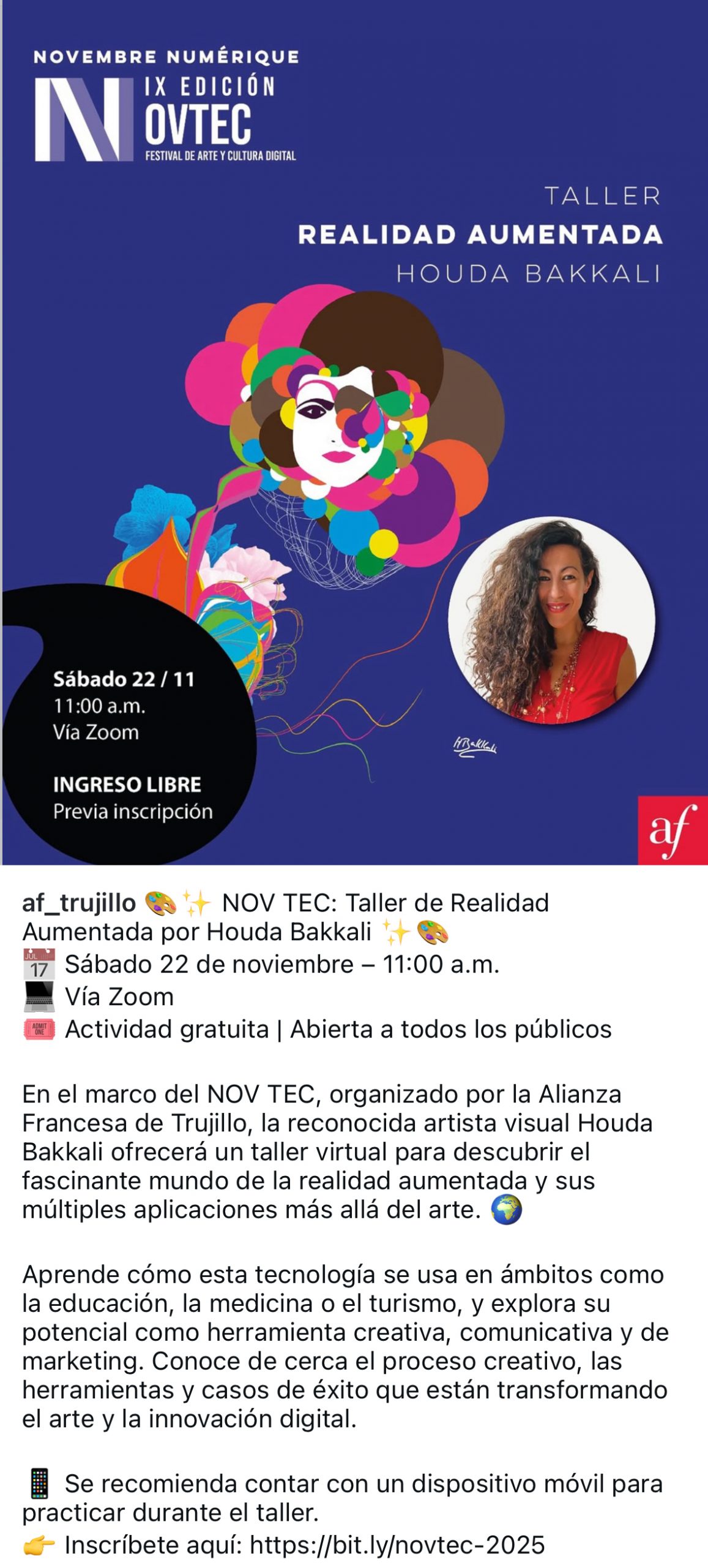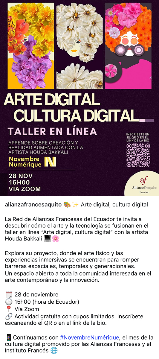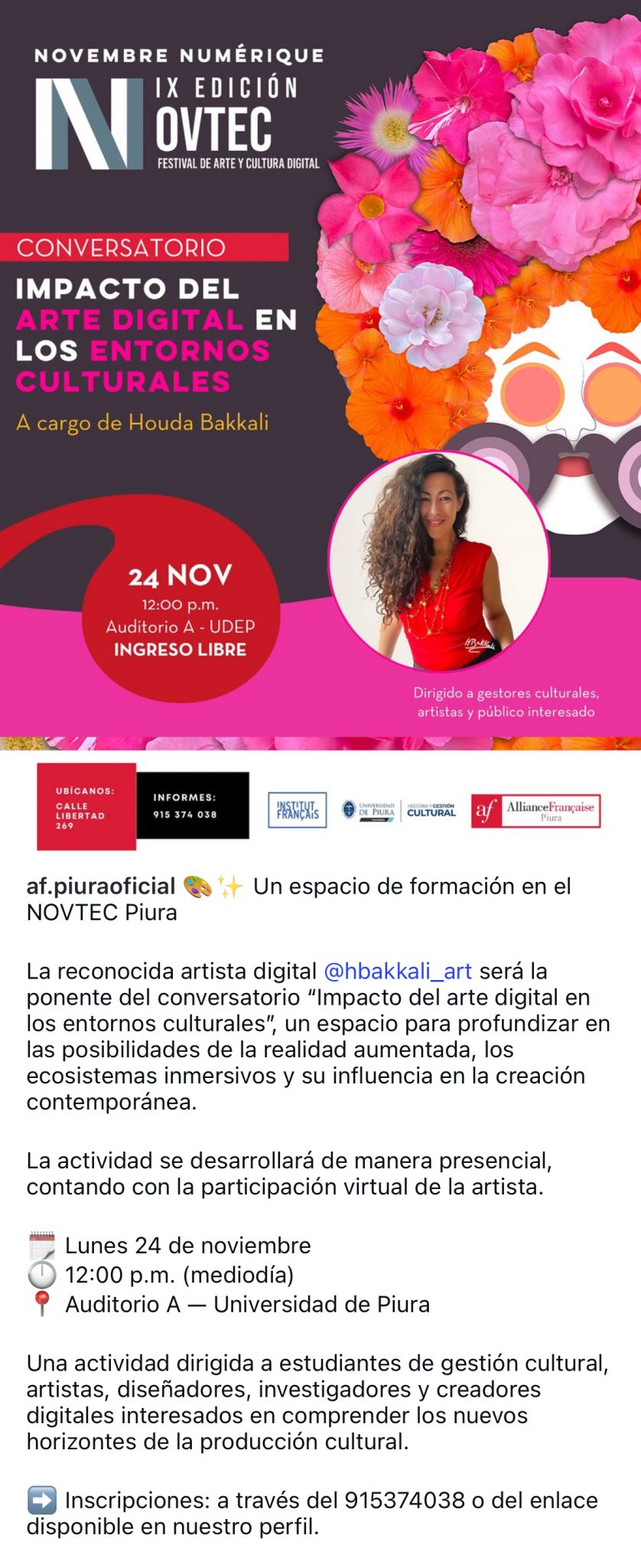 Through the network of the legendary Alliance Française, Houda Bakkali has carried out a wide range of educational and outreach activities, including workshops and masterclasses in countries and cities such as Loja, Quito, Guayaquil, Cuenca and Portoviejo (Ecuador), Mexico City (Mexico), Bogotá (Colombia), Phuket (Thailand), Trujillo (Peru), Piura (Perú) Valdivia (Chile) and Mérida (Mexico), as well as Q&A sessions in Auckland, New Zealand.