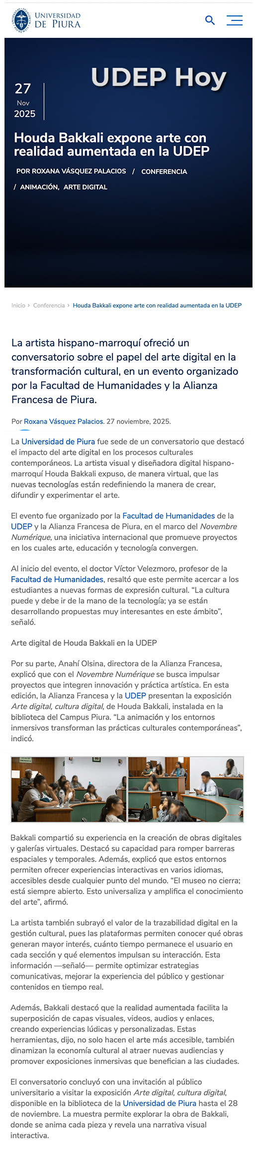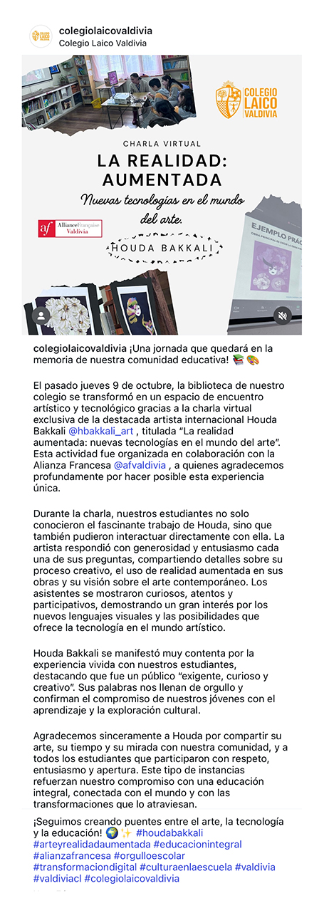 Particularly noteworthy is her lecture at the European Commission during the Madrid Book Fair (Spain), as well as her work at the intersection of art and education through exhibitions held across the Alliance Française in 36 cities and 22 countries. These initiatives promote immersive educational experiences through multimedia and interactive content, addressing the impact, challenges, and opportunities of new technologies applied to art.